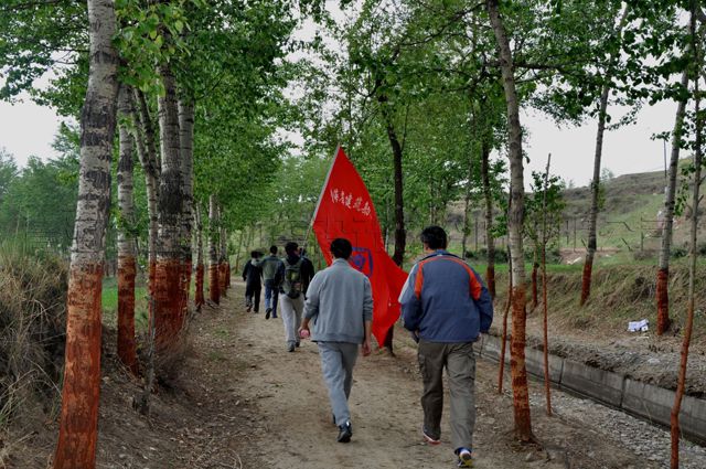 車輪滾滾,約兩小時(shí)的疾奔,四輛大巴載著我們歡愉的心,終于到了徒步的起點(diǎn)——攔隆口鄉(xiāng)上營村。此地是一處鄉(xiāng)野田間,綠油油的麥苗翠綠翠綠,直挺挺的白楊一排一排,泥土的清新沁人心脾,田園如一幅油畫在視野中鋪展開來。