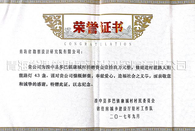 2017年10月26日,湟中縣多巴鎮(zhèn)康城村村民委員會頒給公司一塊獎牌和一本榮譽證書。獎牌上“情系鄉(xiāng)村真奉獻,村莊舊貌換新顏”的十四個紅紅的大字顯得十分醒目。“貴公司為湟中縣多巴鎮(zhèn)康城村捐贈資金壹拾玖萬元整,修建進村道路太陽能路燈43盞。謹(jǐn)對貴公司慷慨解囊、奉獻愛心,造福社會之義舉,深表敬意和誠摯的感謝。特贈此證,以志紀(jì)念”,榮譽證書上暖暖的一番話,記錄了公司對聯(lián)點幫扶村——康城村的真幫扶和真愛心,也表達了康城村村民對公司的一片感恩之情。